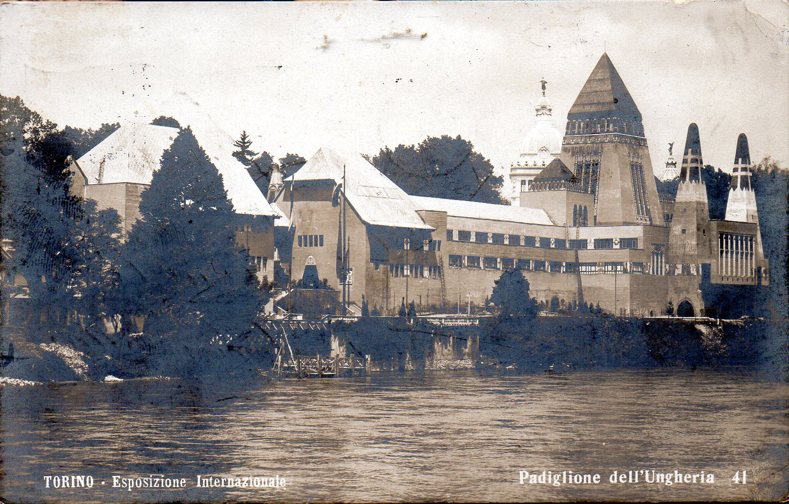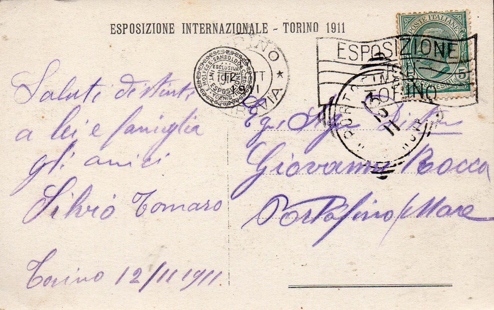 Cartolina spedita dall'Esposizione di Torino del 1911, il francobollo è annullato con il timbro a macchina presso l'Esposizione.