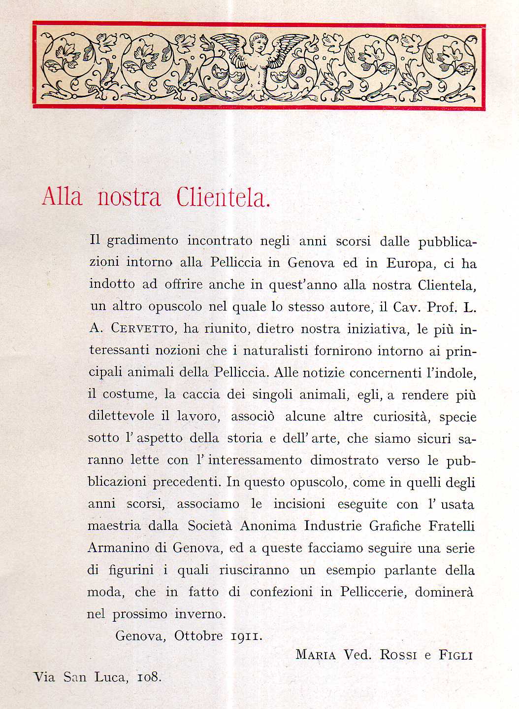 La signora Rossi per pubblicizzare la sua attività, da anni omaggiava la clientela con dei libretti molto belli ed apprezzati, ne presento uno stampato nel 1911, dal titolo "Gli animali da Pelliccia", cenni di Luigi Augusto Cervetto, quest'ultimo era un personaggio molto conosciuto ed importante, grande conoscitore di Genova ed autore di varie e prestigiose pubblicazioni.