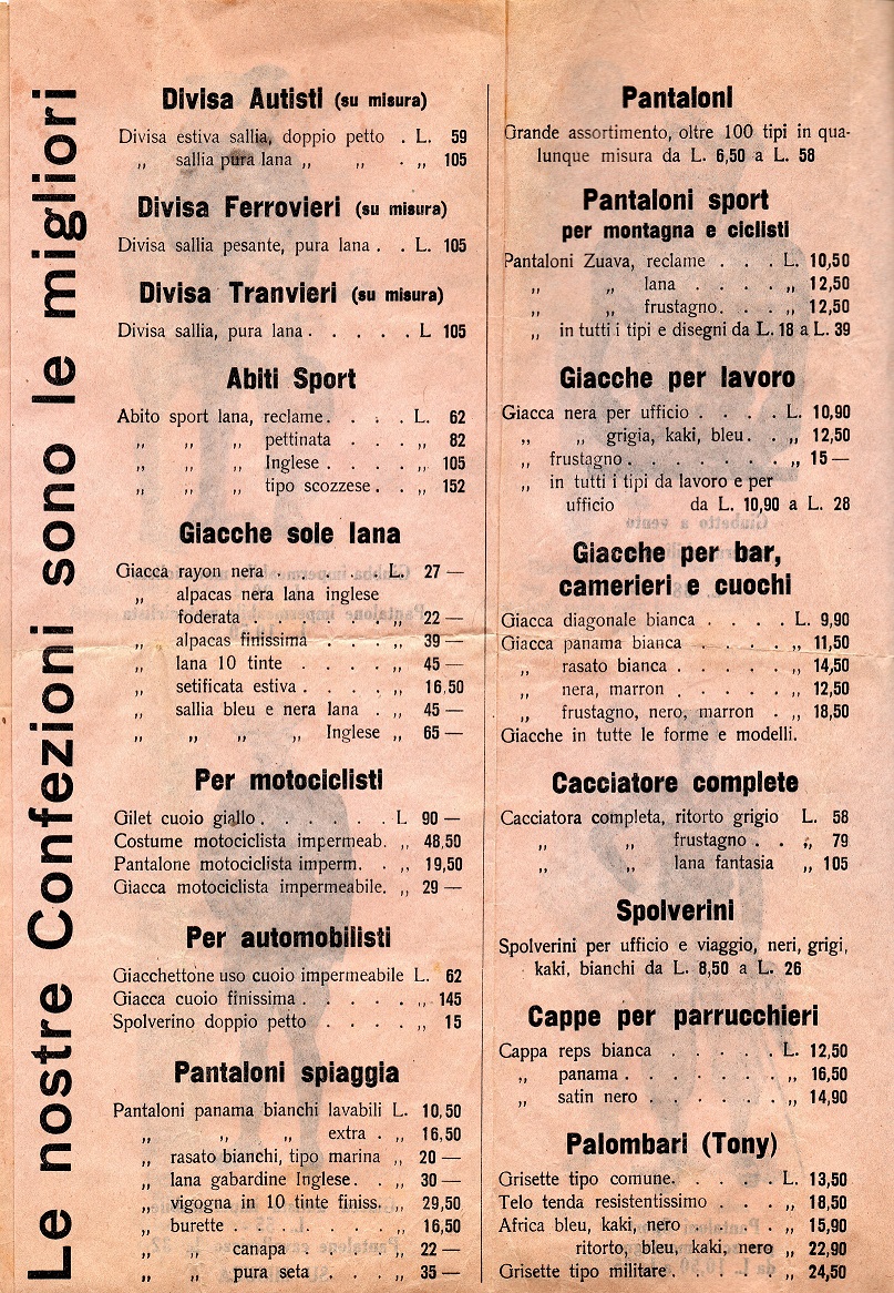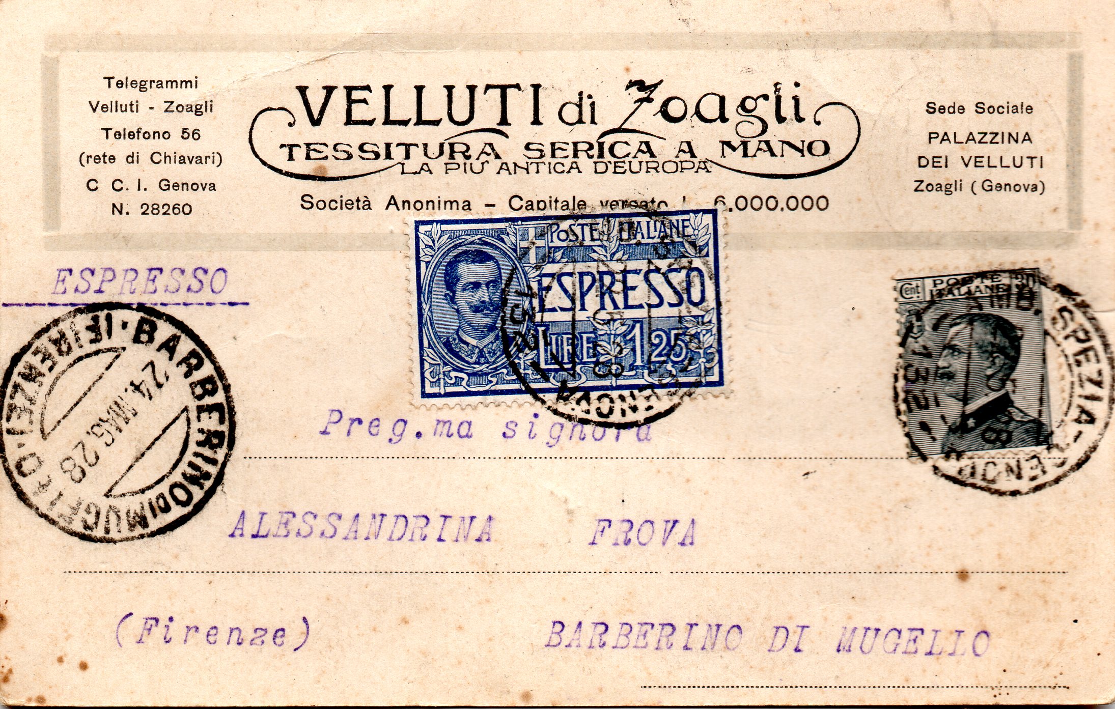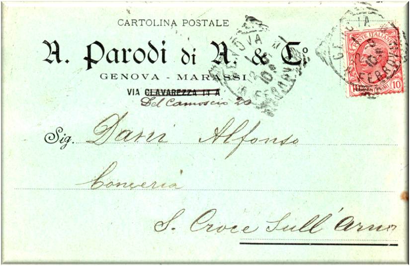 Questa società aveva anche negozio in corso Cavour a La Spezia, e nella cartolina pubblicizza: Seterie-Velluti- Cotoniere stoffe novità per uomo e signora.