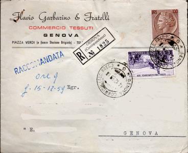 Spedita da Genova per città in data 14 dicembre 1959, affrancata con un valore da L. 100 della serie Siracusana più un valore da L.35 della serie Guerra dell'Indipendenza del 1959.