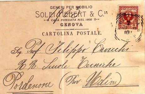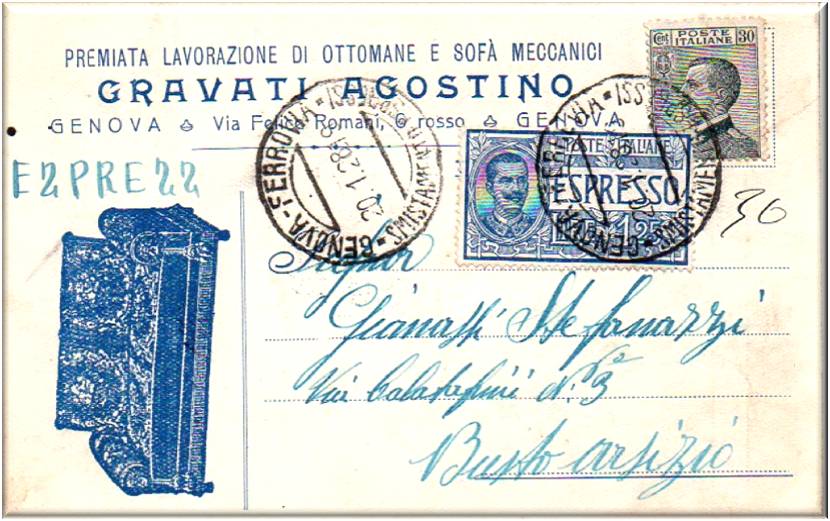 Premiata lavorazione di ottomane e sofà meccanici Genova via Felice Romani, 6 rosso Cartolina vg. in data 20 gennaio 1928, con destinazione Busto Arsizio. Alb.4 Sc.3 P.2