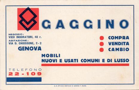 Cartolina pubblicitaria nuova, della ditta GAGGINO MOBILI NUOVI E USATI COMUNI E DI LUSSO.