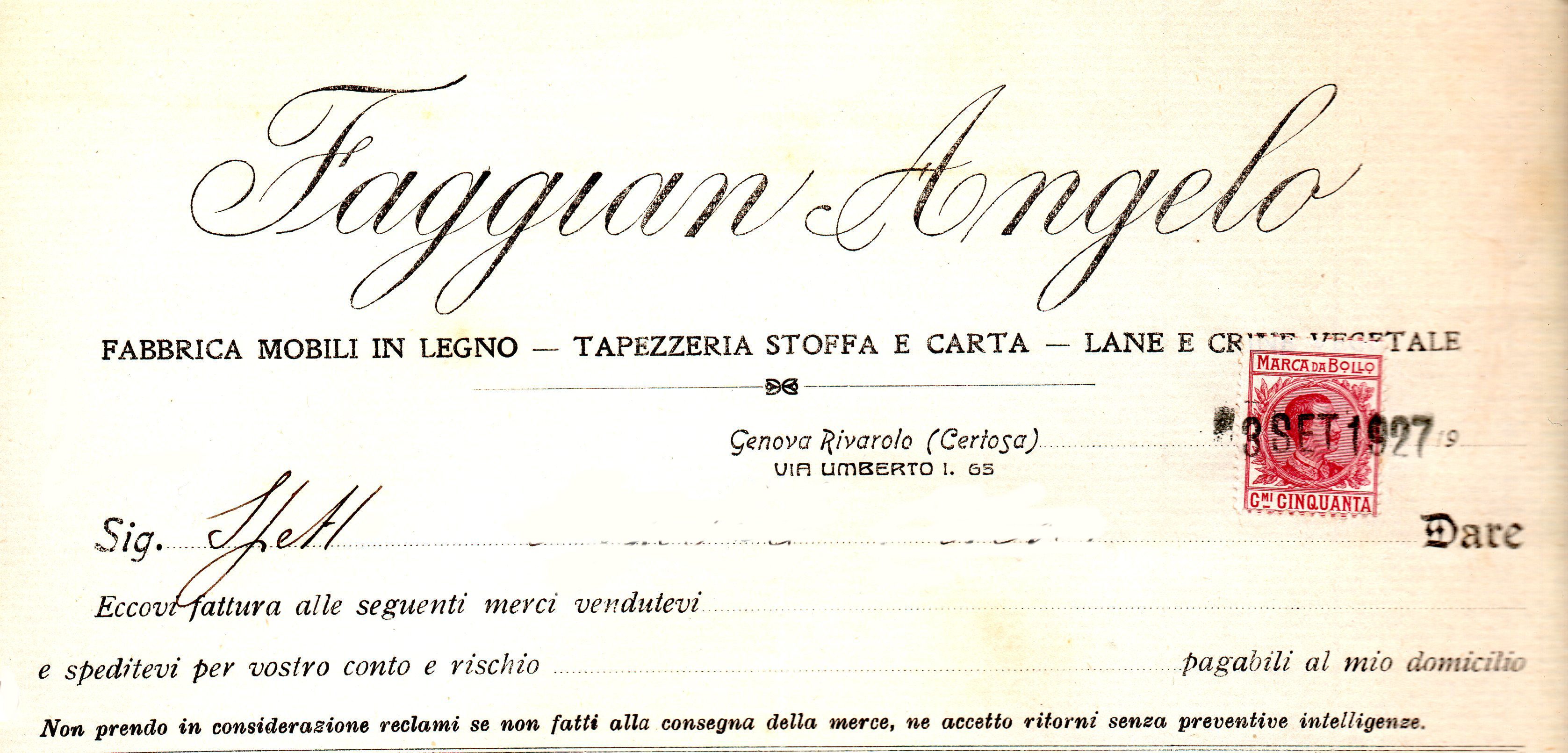 Frontespizio di fattura emessa in data 8 settembre 1927