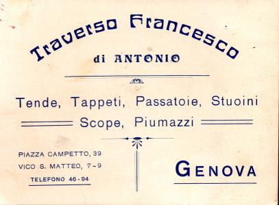 TRAVERSO FRANCESCO di Antonio Vendita di Tende, Tappeti, Passatoie, Stoini, Scope e Piumazzi. Genova piazza Campetto, 39 Vico S. Matteo, 7-9 Biglietto da visita utilizzato come ricevuta di pagamento per due tende da persiane. La ricevuta porta la data del 25 aprile 1918.