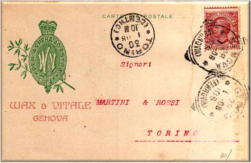 Cartolina vg. in data 29 gennaio 1908 da Genova per Torino con destinazione la mitica Martini & Rossi.