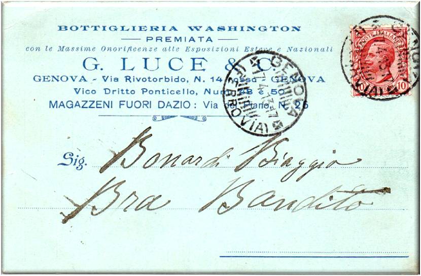 La cartolina è firmata da Luce Giustina ed è stata spedita in data 17 aprile 1913 da Genova a Bra Bandito al signor Bonardi Biaggio, nel testo si conferma di aver ricevuto il vino come campione e di averlo trovato molto buono.