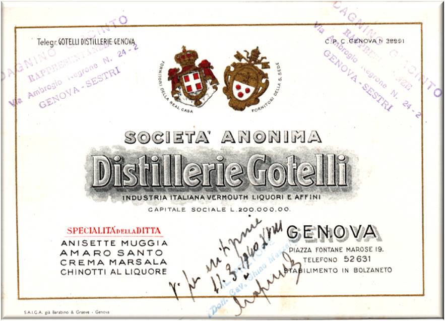 Società Anonima DISTILLERIE GOTELLI Genova