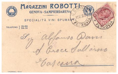 Cartolina pubblicitaria della ditta Magazzini Robotti, specializzata in vini e spumanti, con sede in Sampierdarena.