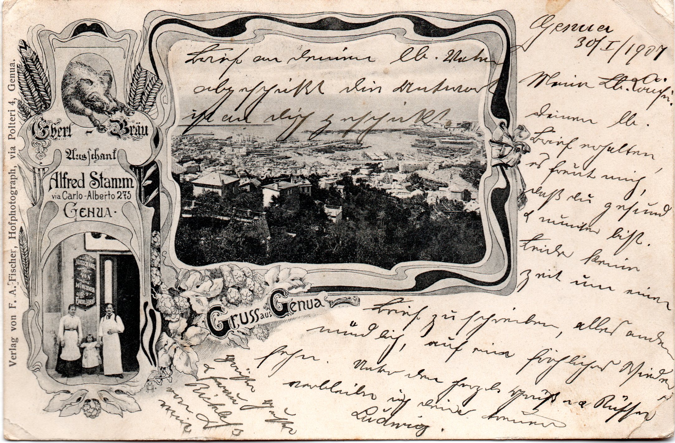 Questa cartolina è stata stampata a Genova ( come si legge nel bordo laterale sinistro) dalla ditta Verlag von F.A. Fischer, via Polteri 4 Genova,