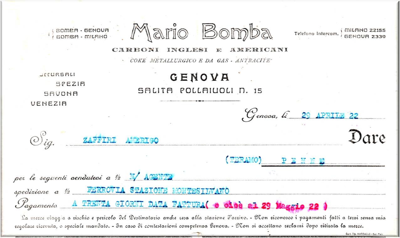 Tassello pubblicitario della ditta MARIO BOMBA commerciante in carboni inglesi e americani.