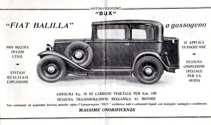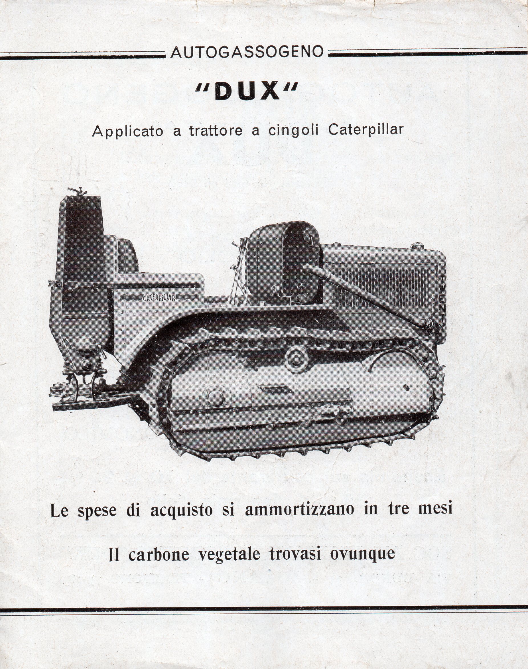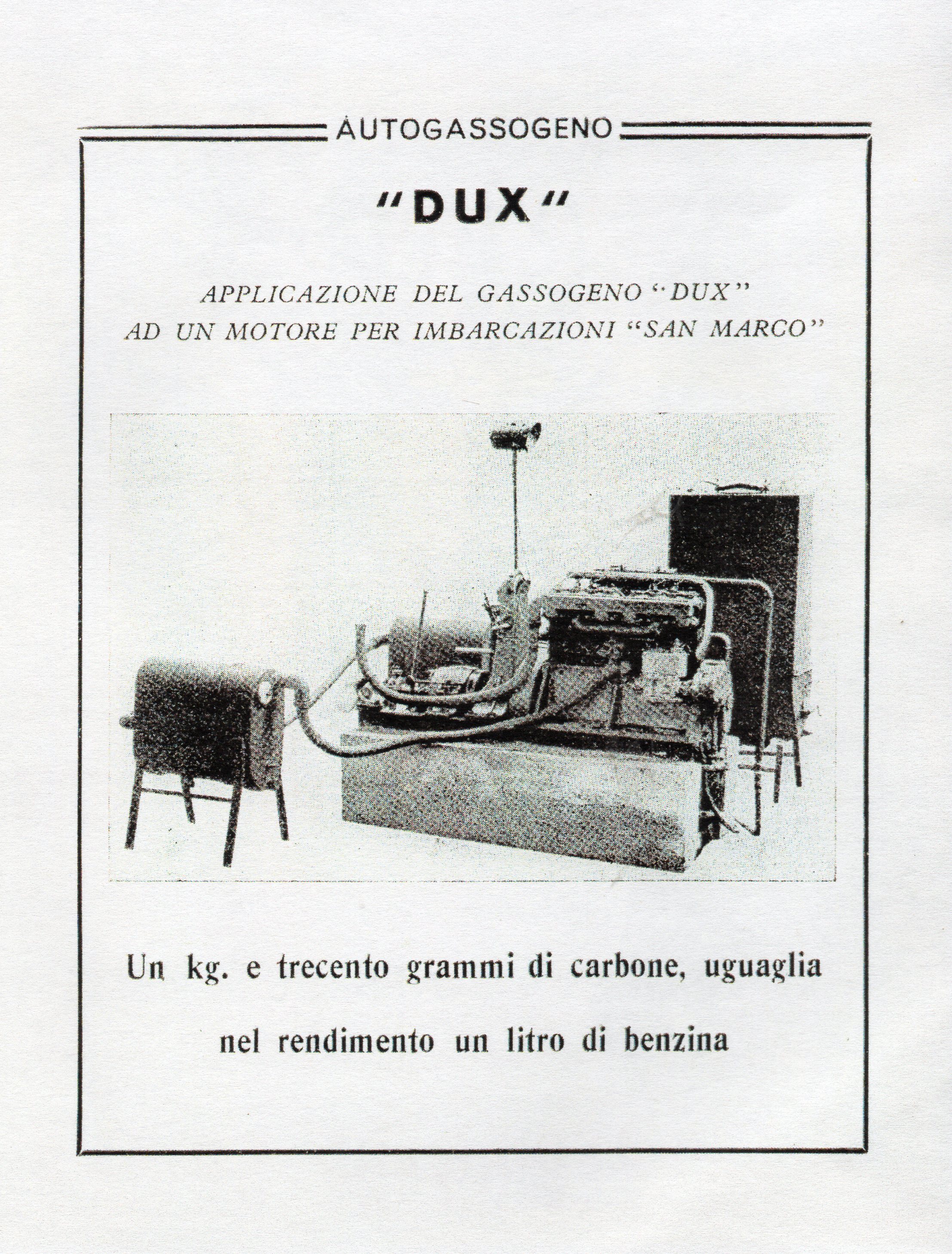 Opuscolo ripiegato in diverse parti, distribuito a Genova dalla ditta Mario Ravano, rappresentante di questo sistema chiamato "AUTOGASSOGENO DUX" che permette un ottimo risparmio energetico per il funzionamento di varie attrezzature, in parte visibili nell'opuscolo.