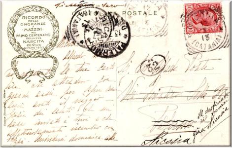 Cartolina emessa per le onoranze a G. Mazzini nel primo centenario della nascita.