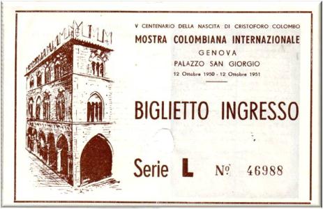 Biglietto emesso per la Mostra Internazionale Colombiana, tenuta a Genova nella prestigiosa sede di Palazzo S.Giorgio in data 12 ottobre 1951