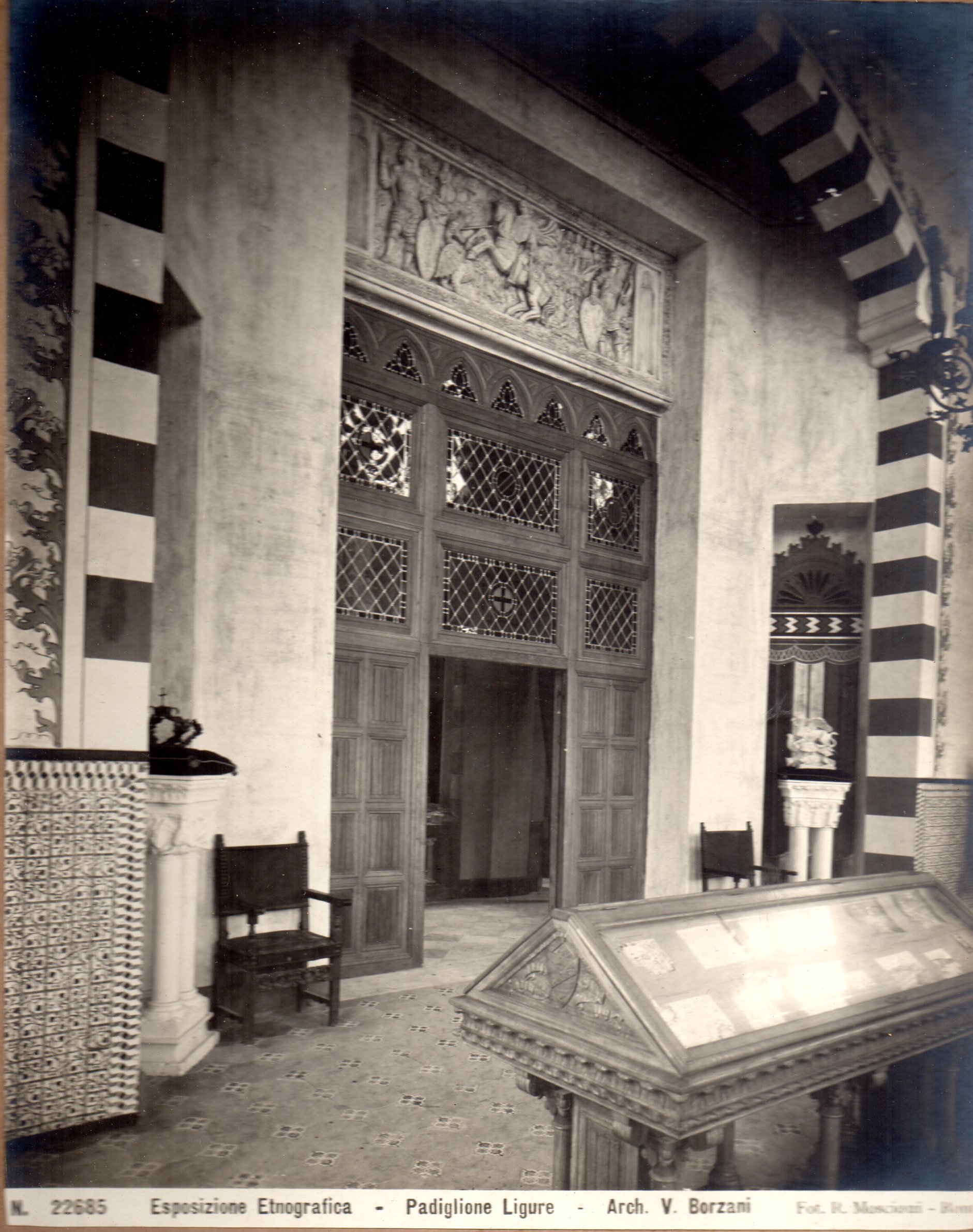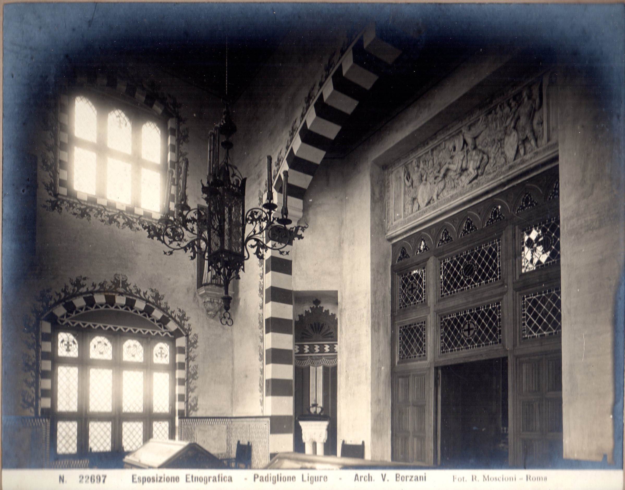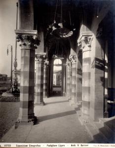 Il padiglione rappresentava nel suo insieme alcuni dei più importanti monumenti genovesi, dalla Cattedrale di S.Lorenzo a Porta Soprana, e gli interni rispettavano una moda in voga in quel periodo, che vedeva come artefice anche il famoso architetto Coppedè.