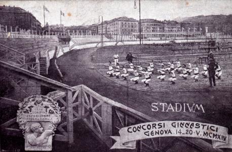 Cartolina ricordo dei Concorsi Ginnastici svoltisi a Genova in occasione dell'Esosizione. Cartolina viaggiata Ediz. Gianinazzi & Co. Alb.2 Sc.4 P.5