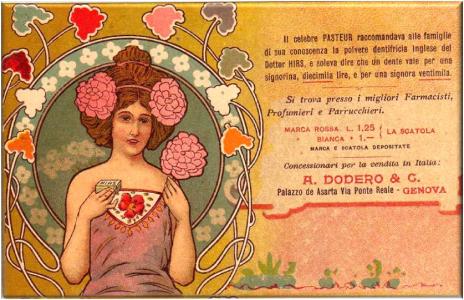 Il celebre Pasteur raccomandava alle famiglie di sua conoscenza la polvere dentifricia inglese del Dottor HIRS, e soleva dire che un dente vale per una signorina, diecimila lire, e per una signora ventimila.