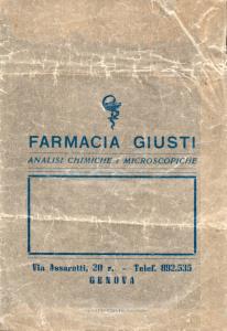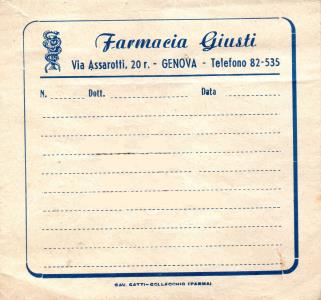 Picola busta pubblicitaria della FARMACIA GIUSTI, negozio in Via Assarotti, 20 Genova.