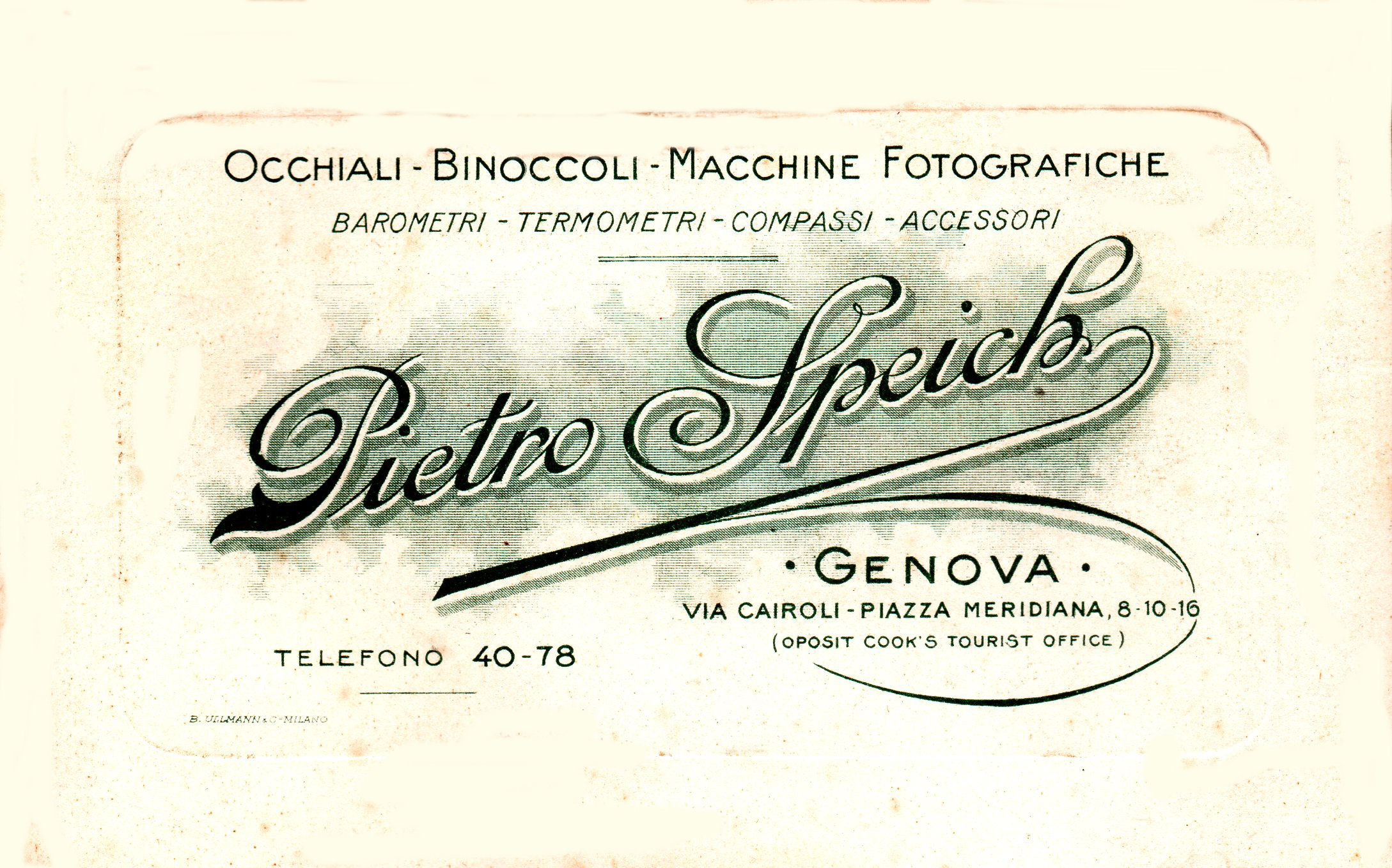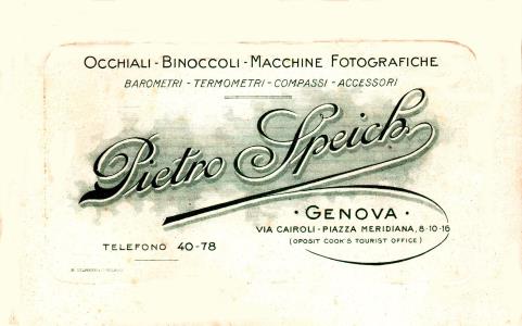 Biglietto da visita della ditta Pietro Speich, con sede in Genova via Cairoli-piazza Meridiana, 8-10-16 Telefono 40-78