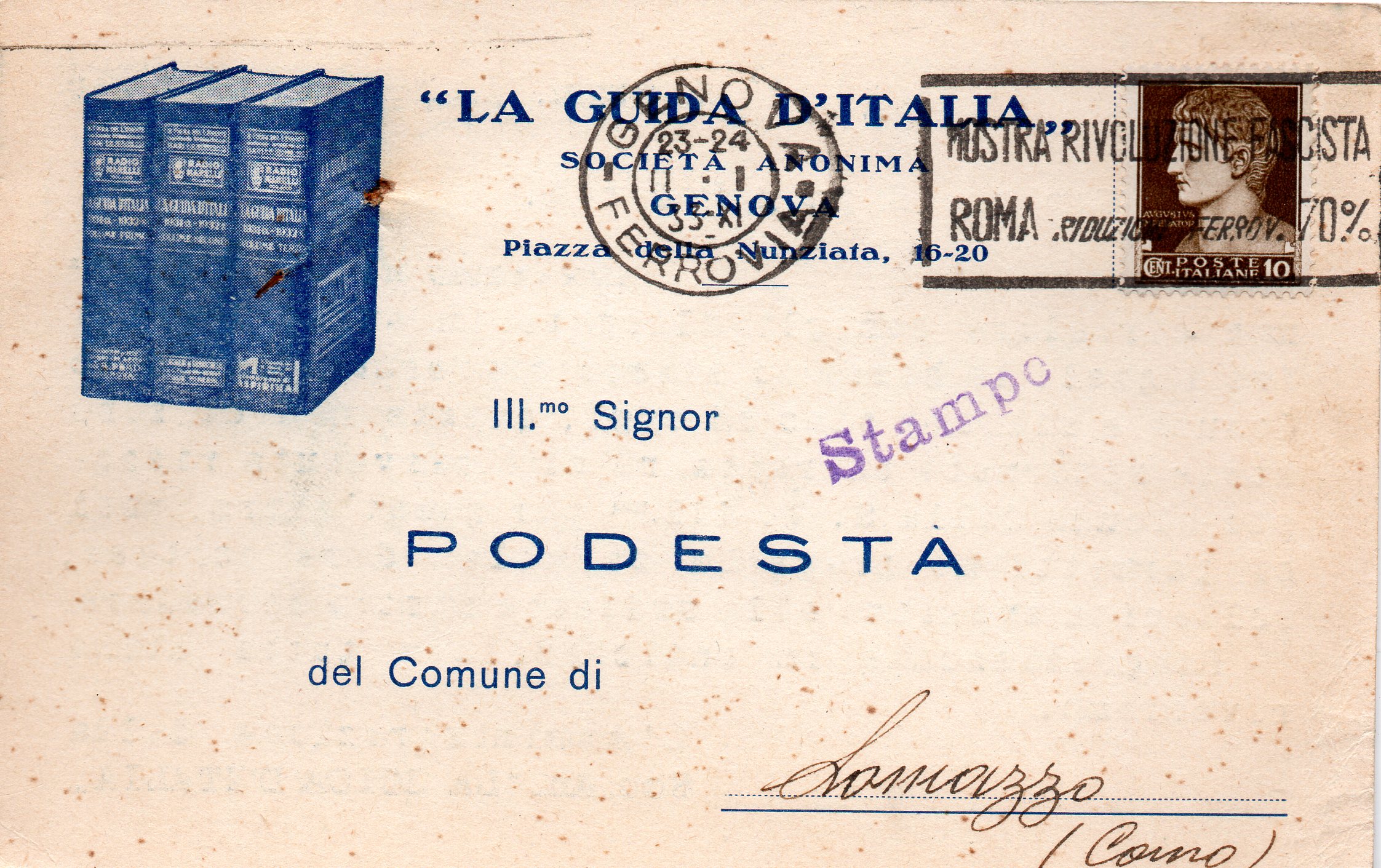 Cartolina pubblicitaria viaggiata della società "LA GUIDA D'ITALIA", con sede in Genova piazza della Nunziata, 16-20.