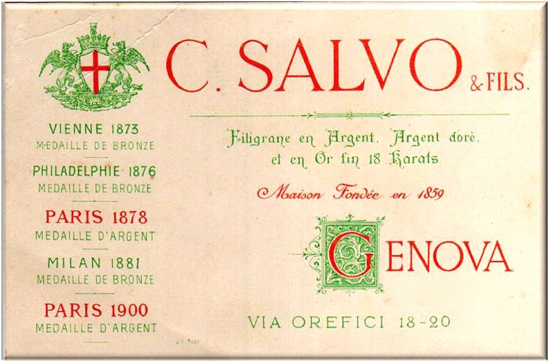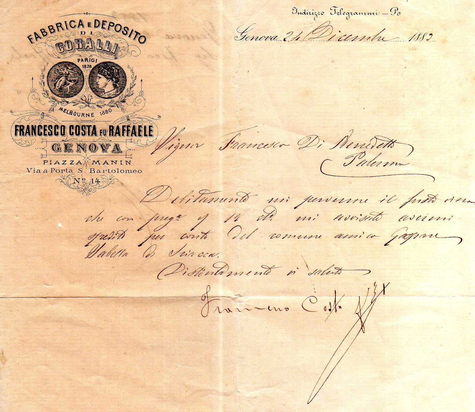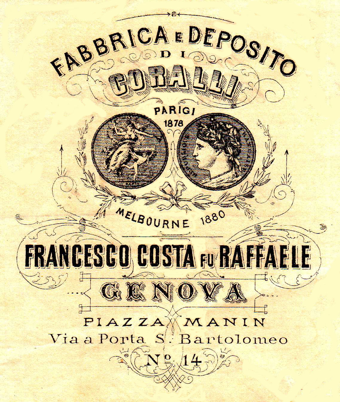 Fabbrica e Deposito di Coralli FRANCESCO COSTA FU RAFFAELE Genova piazza Manin Via a Porta S.Bartolomeo n°14