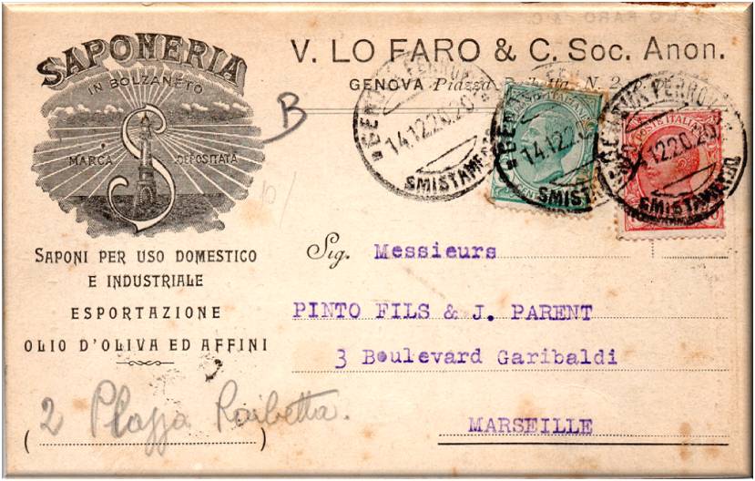 Cartolina viaggiata in data 14 dicembre 1920 con destinazione Marsiglia.