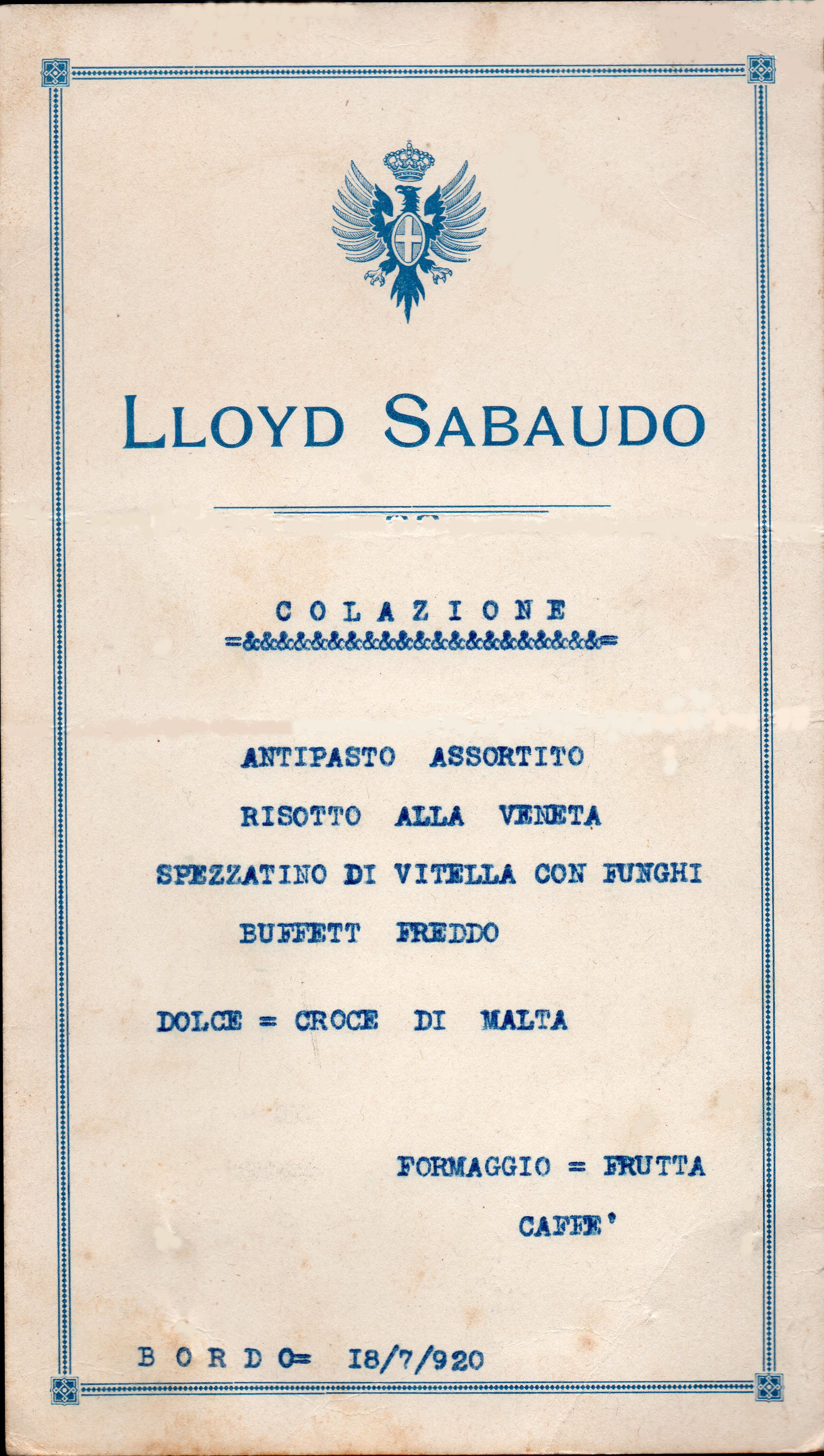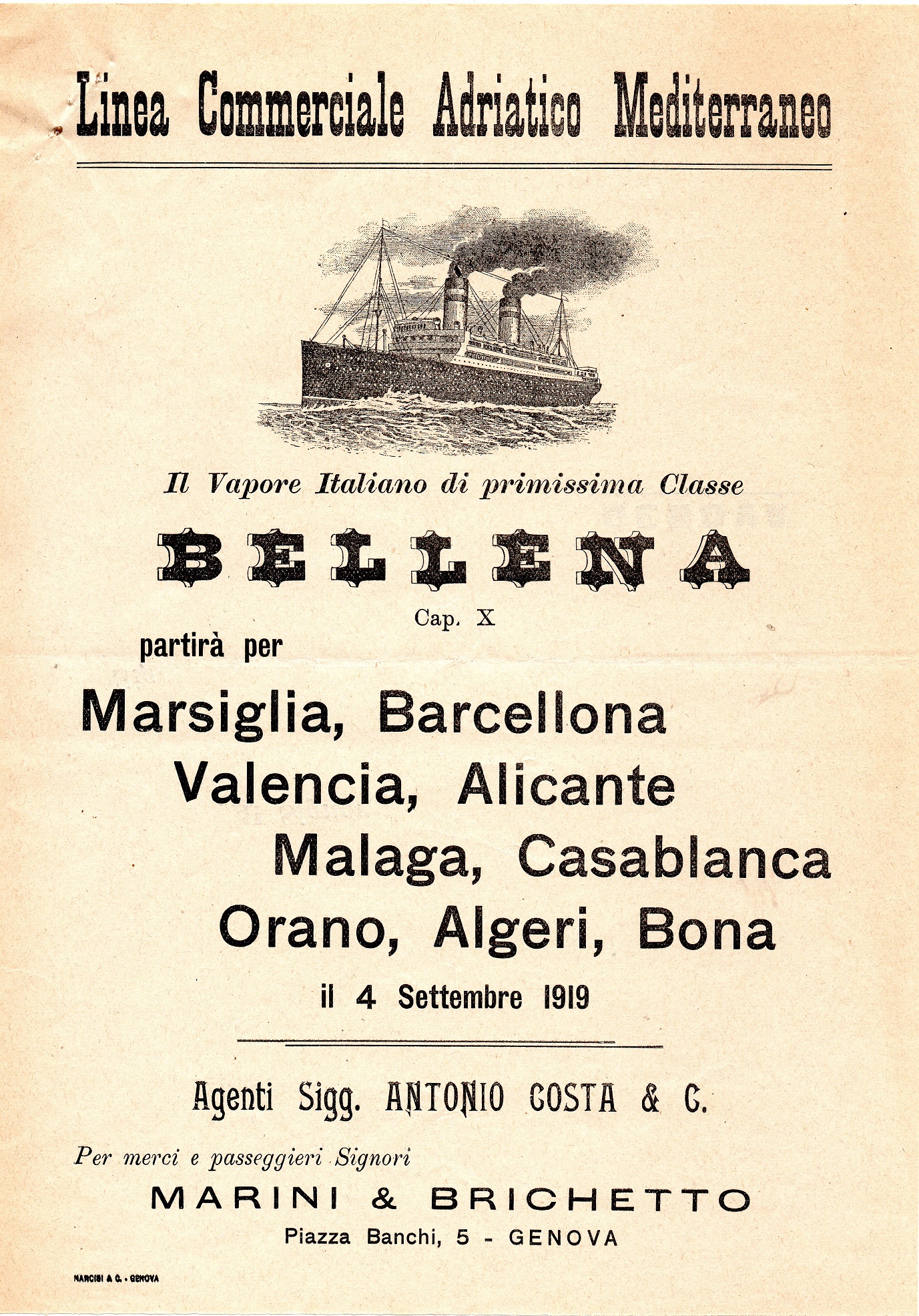 Come si legge sull'opuscolo il vapore BELLENA parirà per il 4-Settembre 1919 per: