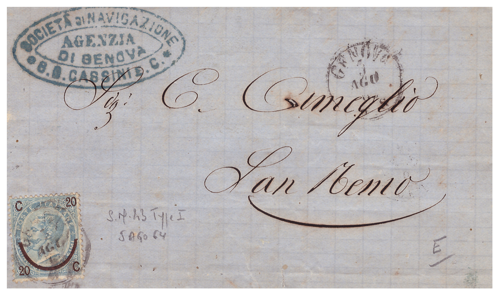 Lettera del 5 agosto 1864 da Genova a San Remo spedita dalla Agenzia della Società di navigazione G.B. Cassini e C.