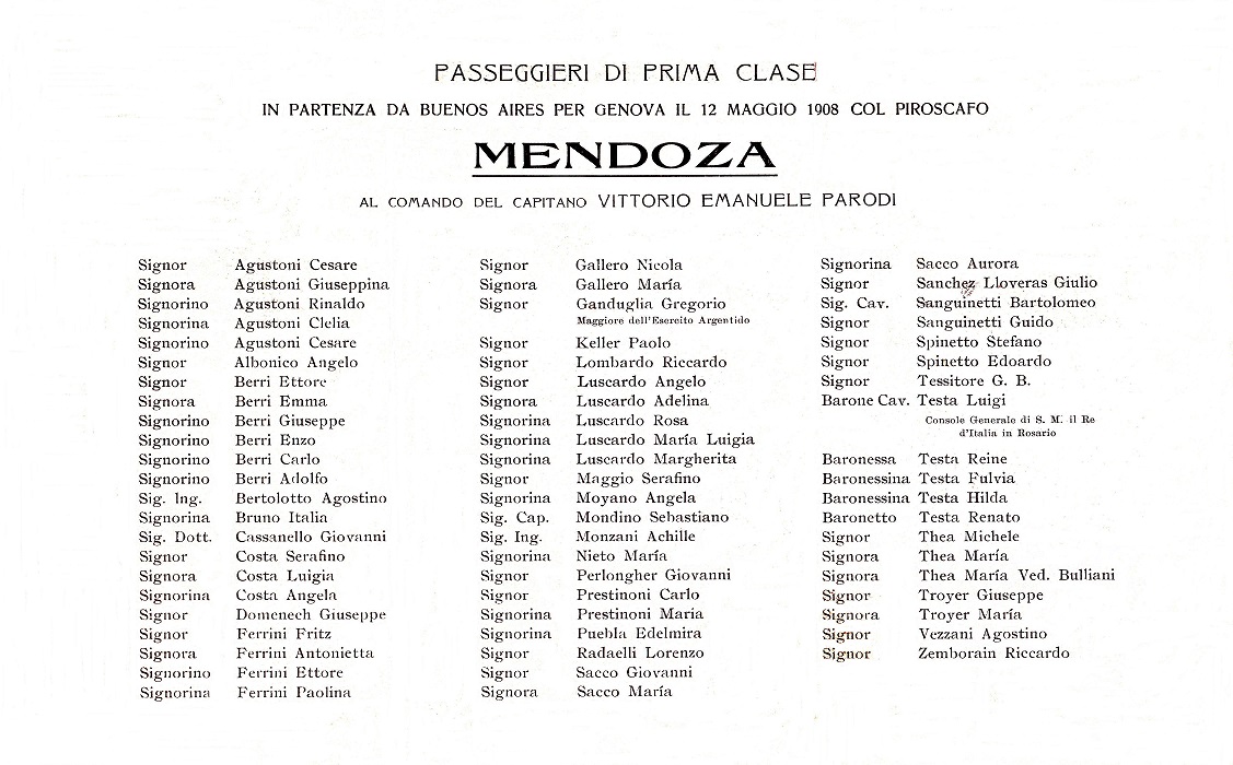 L'opuscolo riporta nella parte interna l'elenco dei passeggeri di 1° Classe in partenza sul Mendoza da Buenos Aires per Genova il 12 Maggio 1908.