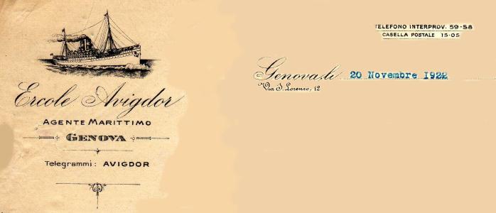 Intestazione di fatt. emessa il 20 novembre 1922, della ditta Ercole Avigdor agente marittimo.