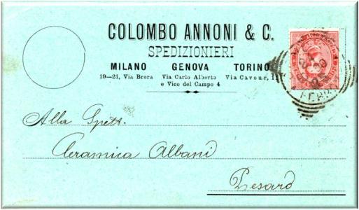 Cartolina spedita da Genova in data 24 ottobre 1890 alla ditta Ceramica Albani di Pesaro.