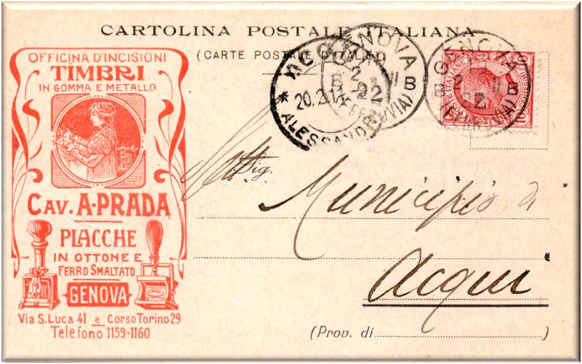 Cartolina viaggiata in data 19 agosto del 1909, con destinazione Acqui,