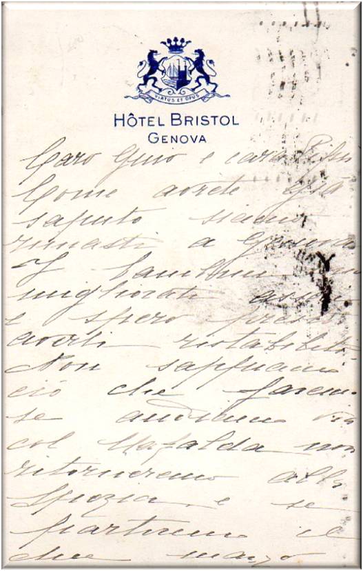 Retro della cartolina, con l'indicazione del titolare della cartolina e come si legge "COMITATO ESECUTIVO-GENOVA, collocato all'interno dell'Albergo Bristol.