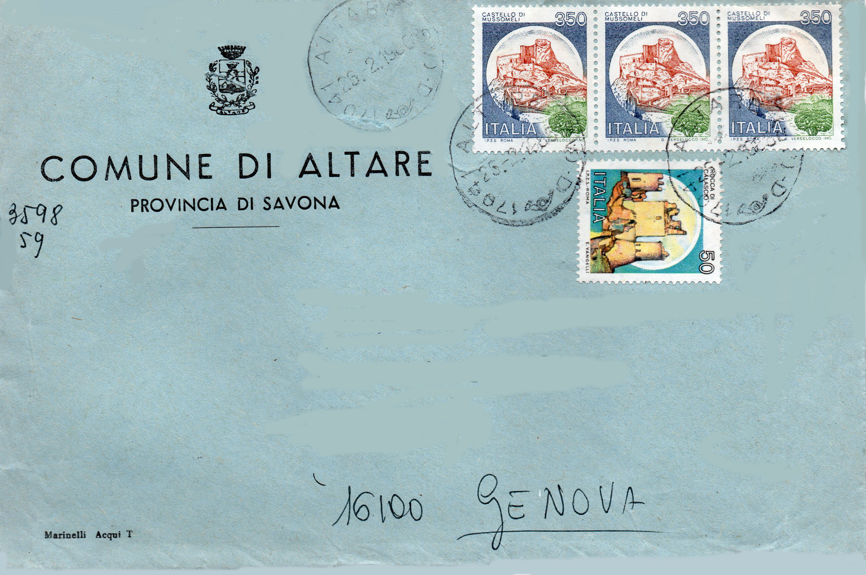 Busta pubblicitaria del Comune di Altare, spedita in data 26 febbraio 1986, affrancatura per Lire 1150.