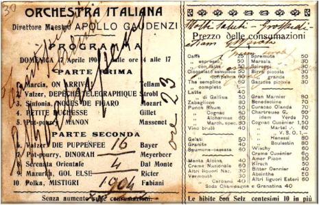 Programma musicale del pomeriggio di Domenica 7 aprile 1904 dalle 14 alle 17 dell'orchestra Italiana diretta dal Maestro Apollo Gaudenzi.