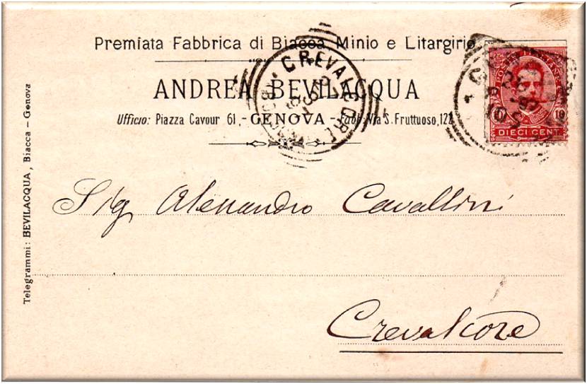 Cartolina commerciale, della ditta ANDREA BEVILACQUA viaggiata in data 27 marzo 1897.