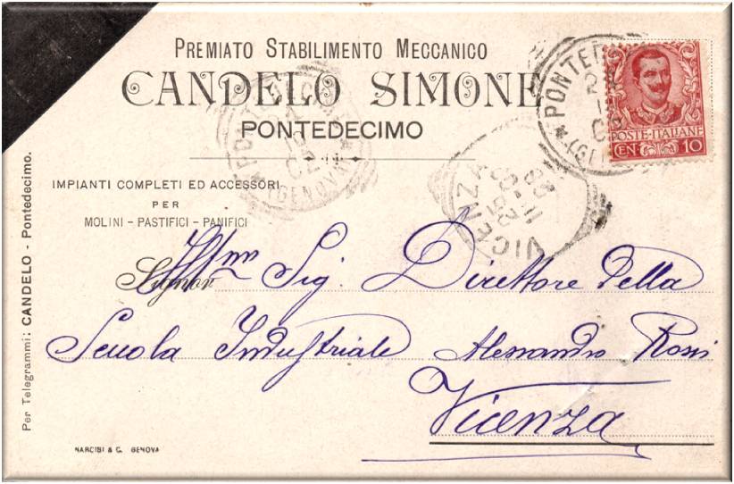 Cartolina viaggiata in data 24 ottobre 1902 con destinazione Scuola Industriale Alessandro Rossi, Vicenza