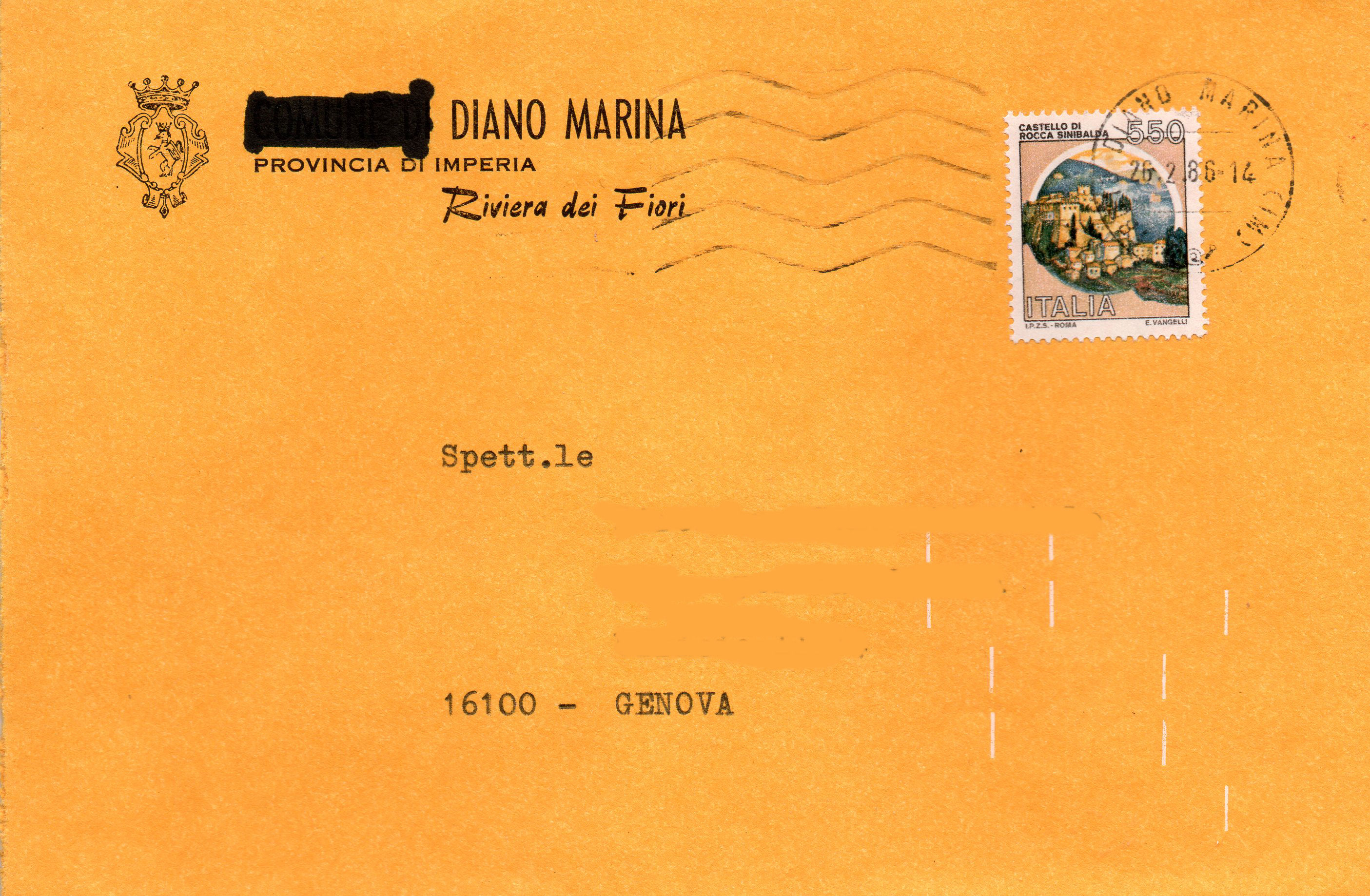 Busta pubblicitaria del Comune di Diano Marina, spedita in data 26 febbraio 1986, affrancata con un valore da Lire 550.