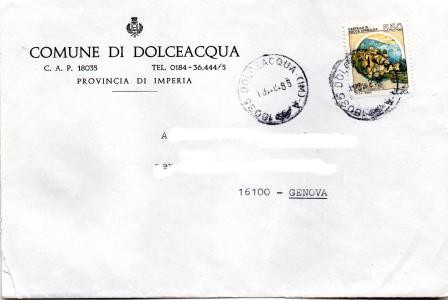 Busta pubblicitaria del Comune di Dolceacqua, spedita in data 13 febbraio 1986, affrancata con un valore da Lire 550.