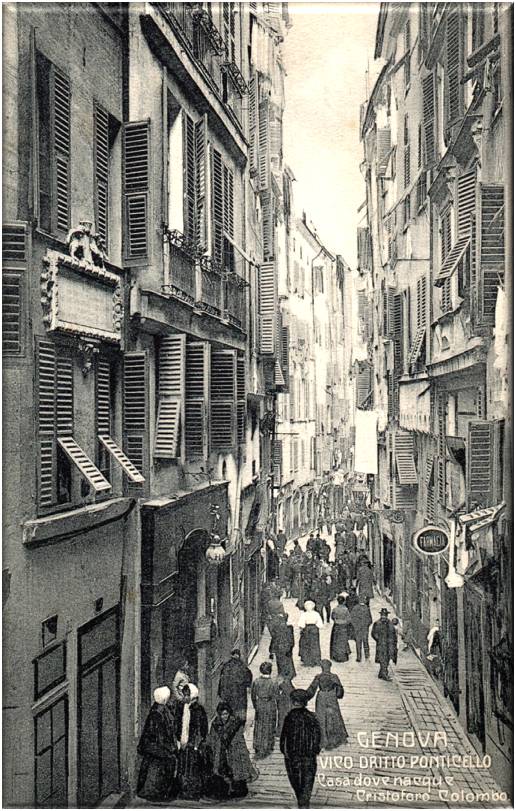 Cartolina tematica, sulla destra si vede l'insegna della farmacia, per adesso non ne conosco il nome, era quasi difronte alla casa di C.Colombo.
