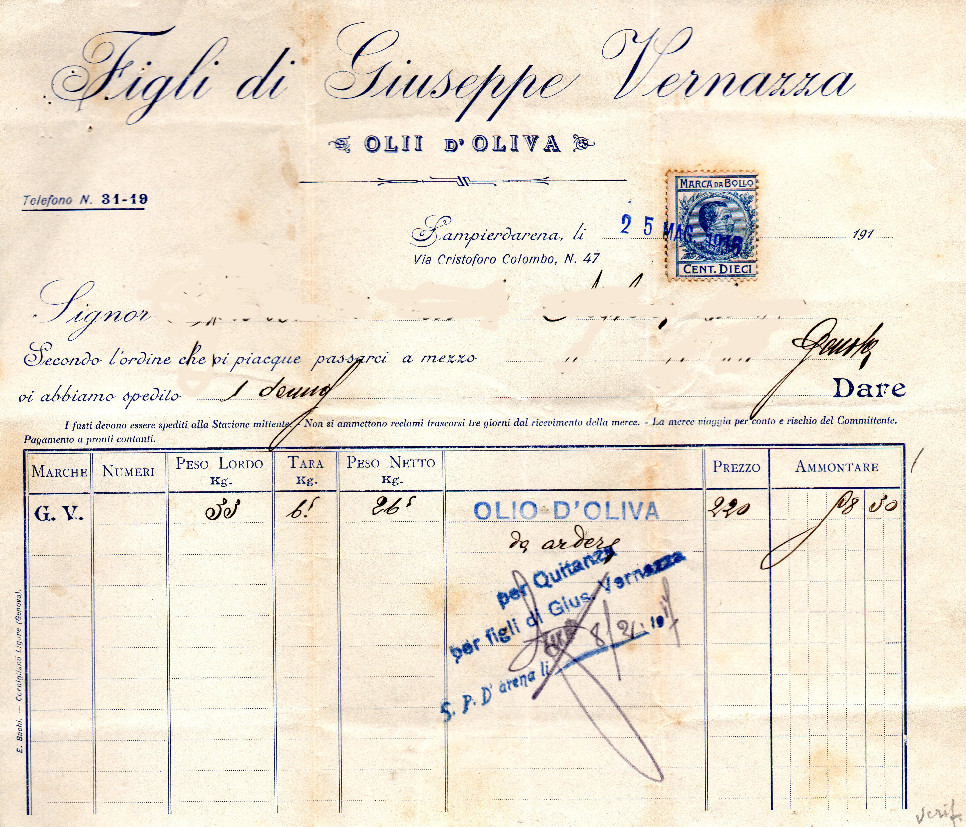 Fattura emessa il 25 maggio 1916