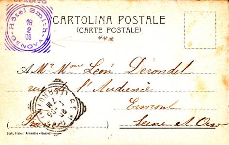 Cartolina acquistata presso l'Hotel Smith, lo dimostra il timbro posto al retro della cartolina, spedita il 20 febbraio 1906.