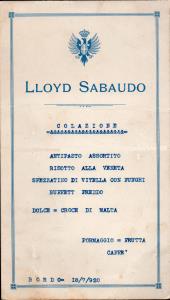 Piccolo menù utilizzato a bordo, come scritto nel margina, in data 18 luglio 1920