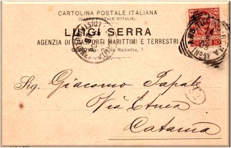 Nel testo della cartolina si comunica: che a mezzo del signor Arcidiacono in Dogana è stata spedita una damigiana di vino.