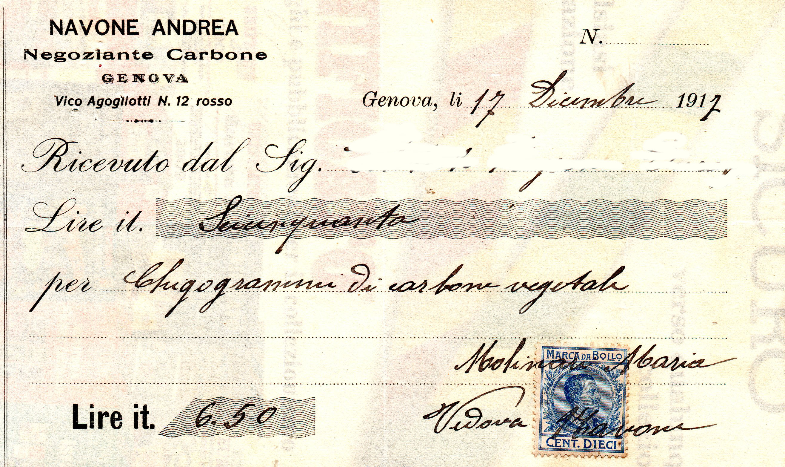 Ricevuta per l'acquisto di Carbone emessa in data 17 dicembre 1917 per un importo di lire 6,50.