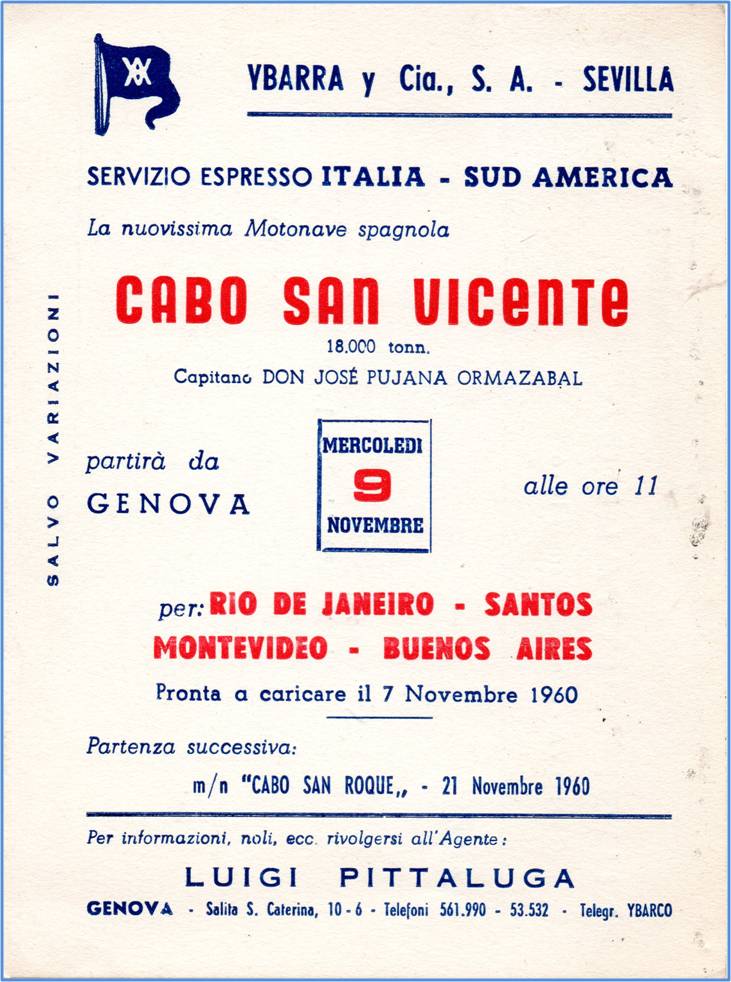 Con questa C. l'agente comunica che il 9 novembre 1960 partirà da Genova alle ore 11 la nuova Motonave "CABO SAN VINCENTE" di 18.000 tonn, Capitano DON JOSE' PUJANA ORMAZABAL, della compagnia YBARRA Y Cia., S.A. -SEVILLA, con destinazione RIO DE JANEIRO-SANTOS-MONTEVIDEO-BUENOS AIRES.
