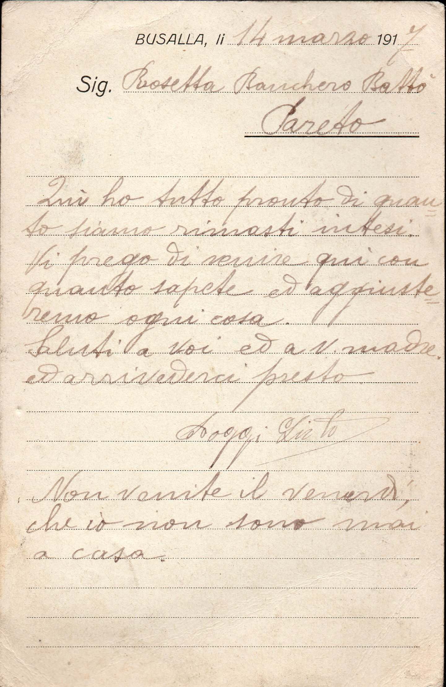 Viaggiata in data 14 marzo 1917 da Busalla per Pareto, il francobollo da cent. 10 è annullato con il frazionario 28-42 assegnato all'ufficio postale di Busalla.