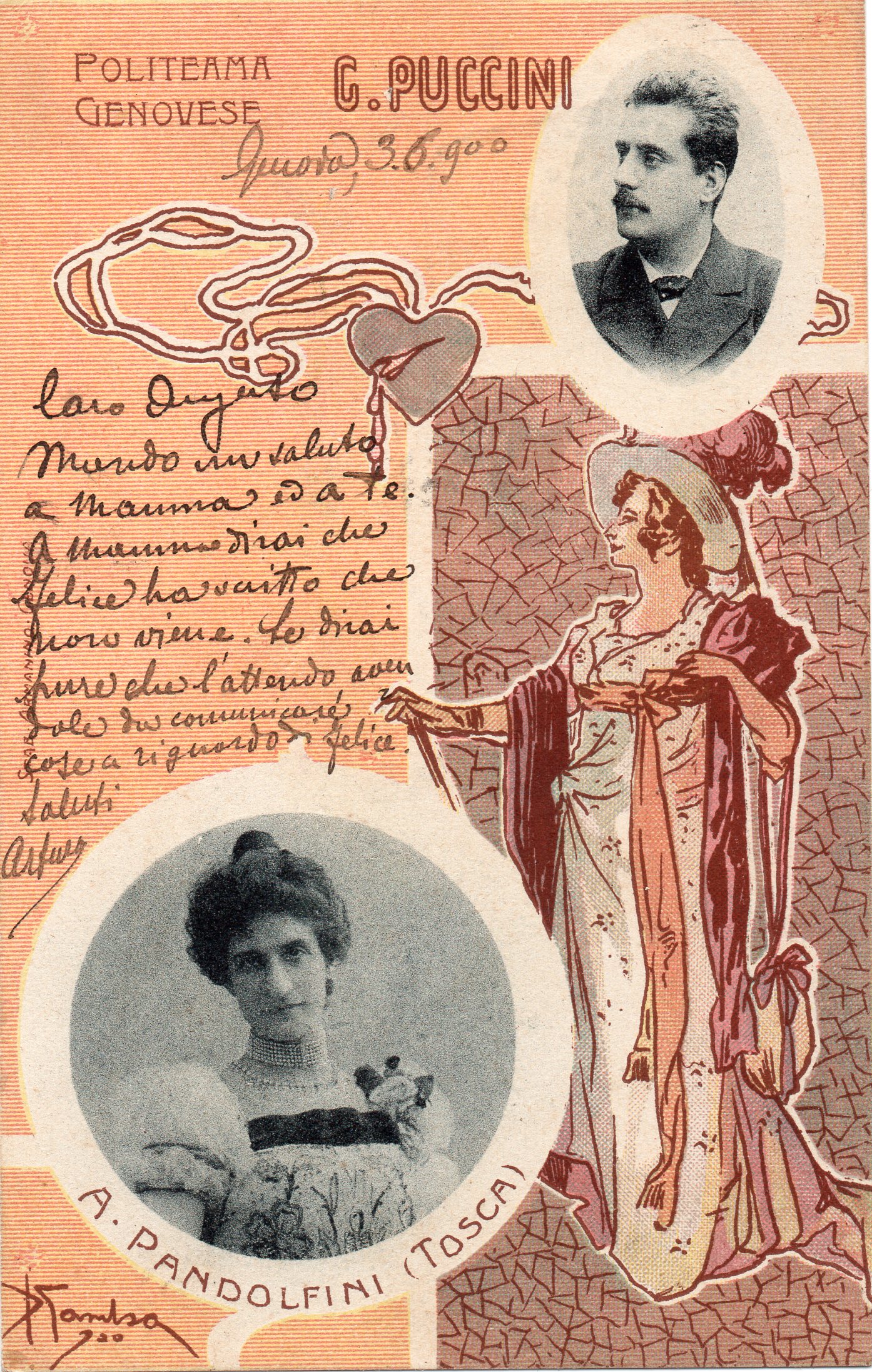 Cartolina pubblicitaria per la rappresentazione di Tosca la grande opera di Puccini.