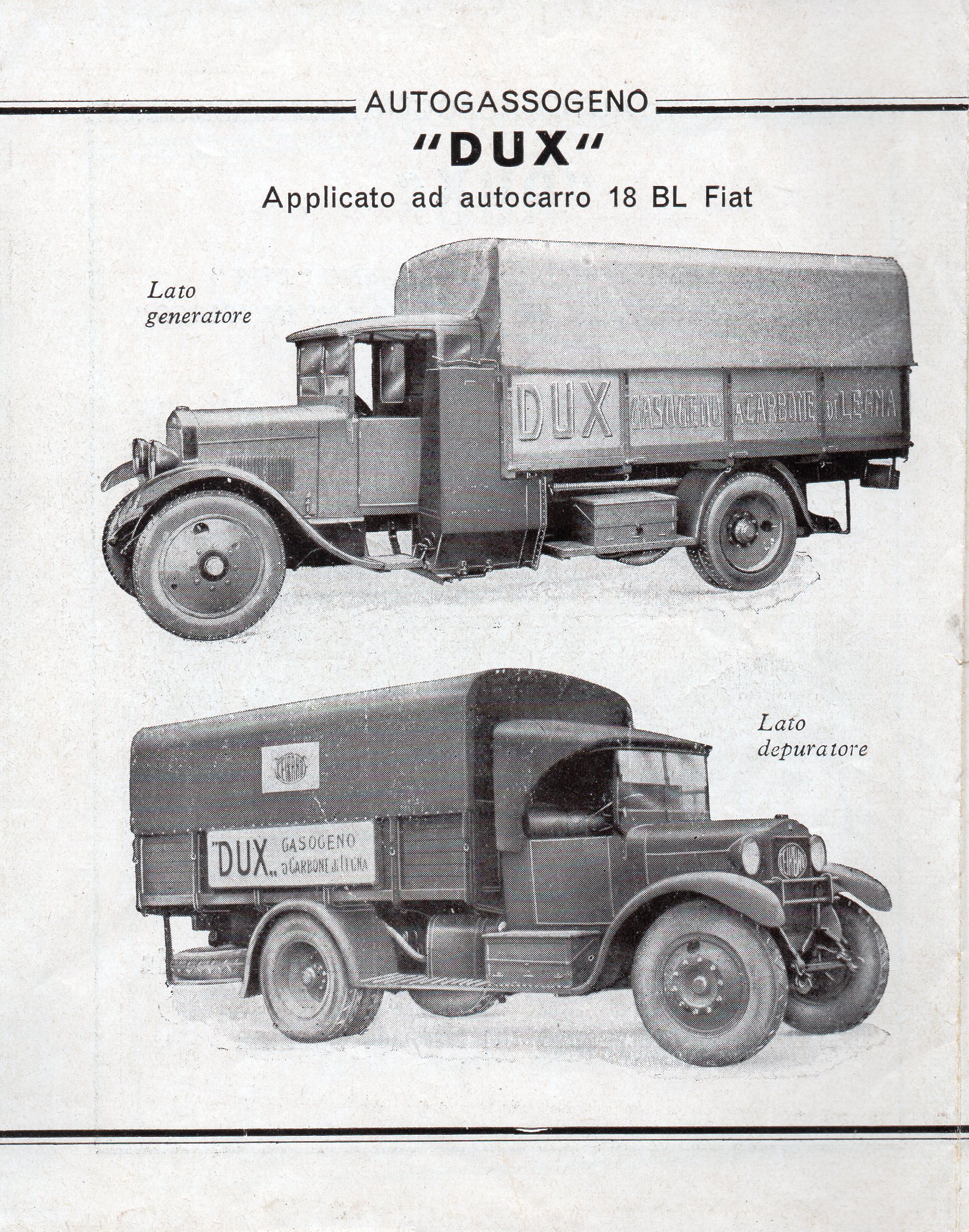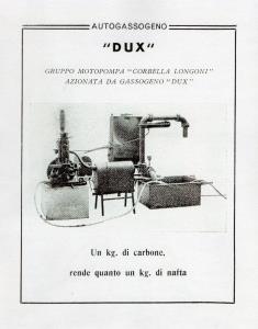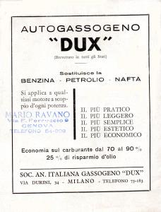 Opuscolo ripiegato in diverse parti, distribuito a Genova dalla ditta Mario Ravano, rappresentante di questo sistema chiamato "AUTOGASSOGENO DUX" che permette un ottimo risparmio energetico per il funzionamento di varie attrezzature, in parte visibili nell'opuscolo.
