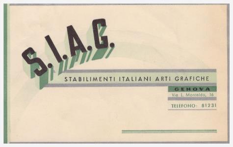 Biglietto da visita pubblicitario, della società S.I.A.G., Stabilimenti italiani arti grafiche.