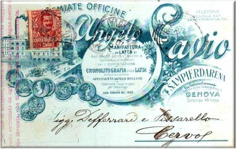 Nel testo il signor Savio motiva il ritardo nella consegna della merce allo sciopero, per questo motivo ha inserito un timbro in rosso nel lato sinistro della cartolina, in cui si legge:nei casi di sciopero, serrata ed altri di forza maggiore resto svincolato da ogni obbligo sia di consegna merce da me lavorata, che di ritiro merce da me contrattata.